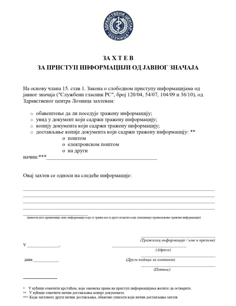 Информатор о раду доступан је јавности у електронском облику почев од 22. новембра 2024. године. На порталу Повереника за информације од јавног значаја и заштиту података о личности, путем за то предвиђене апликације и у за то предвиђеној форми, можете погледати Информатор о раду Здравственог центра Лозница